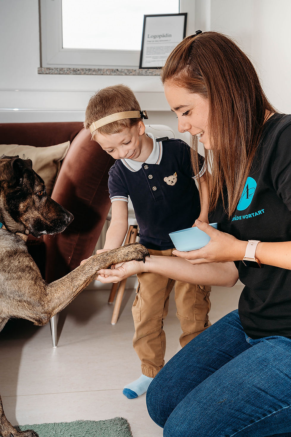 Seit sie 11 Wochen alt ist, gehen wir einmal wöchentlich in die Hundeschule. Die erste Prüfung zur Alltagstauglichkeit Stufe 1 haben wir bereits abgelegt. Nach Stufe 2, darf sie mit der Therapiebegleithundeausbildung beginnen. Bis zum Ende ihrer Ausbildung darf sie einfach "nur" ein Praxishund sein. Sie wird aber bereits häufig aktiv in die Therapie eingebunden. Natürlich kann sie auch auf Wunsch der Patienten in einem anderen Raum warten, sollten diese Angst vor Hunden haben.